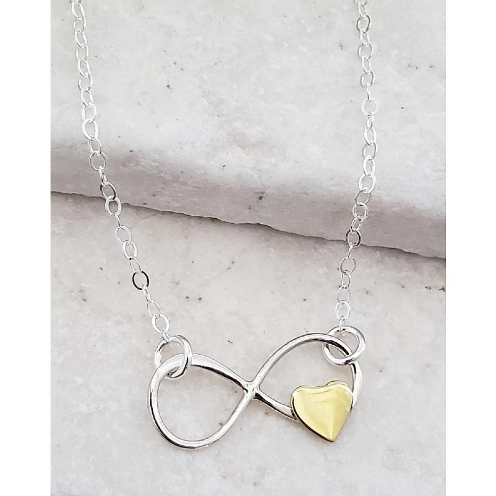 Show your LOVE with these infinity with heart necklace. These necklace is made of .925 sterling silver with gold plated heart. With infinite styling options, this symbolic piece adds a simple shining touch to any look.