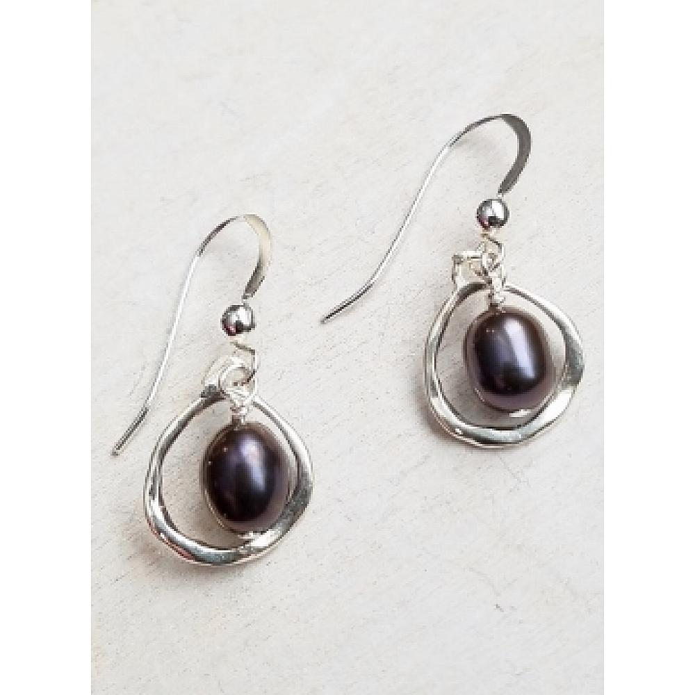 A pair of French ear wire style earrings are so lovely in silver and black. A wire wrapped peacock black pearl pod dangles in the center surrounded by an imperfect round shape.