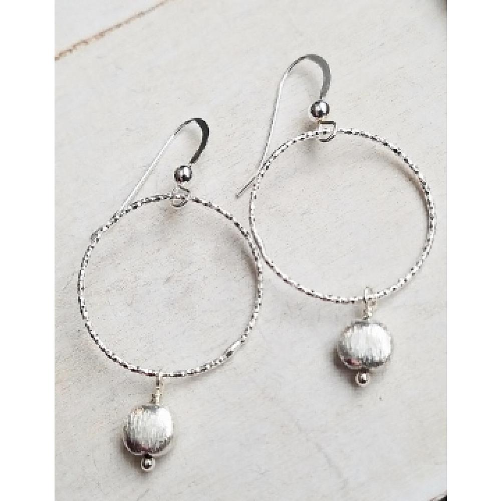These trendy and classic look of sterling silver diamond cut hoop with brushed silver drop is perfect for every occasion.