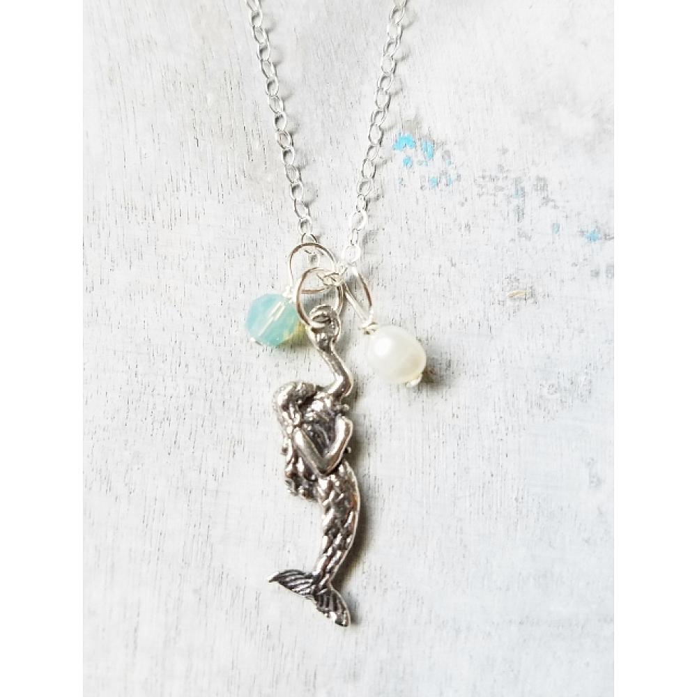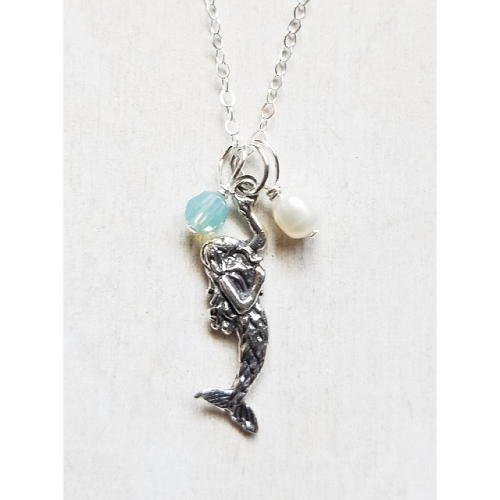 Mystical and magical mermaid sterling silver necklace adorned with the finest European crystal in pacific opal and white freshwater pearl hangs on 18" sterling silver cable chain with spring clasp.