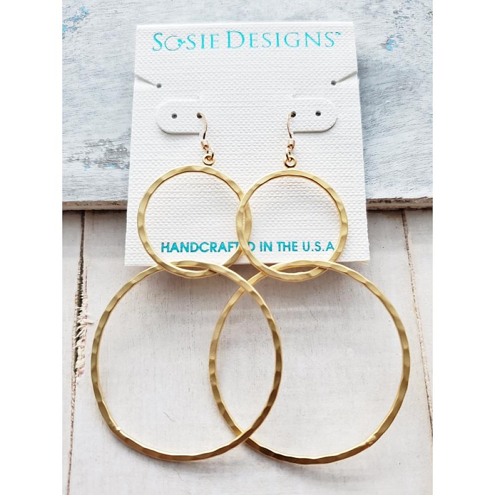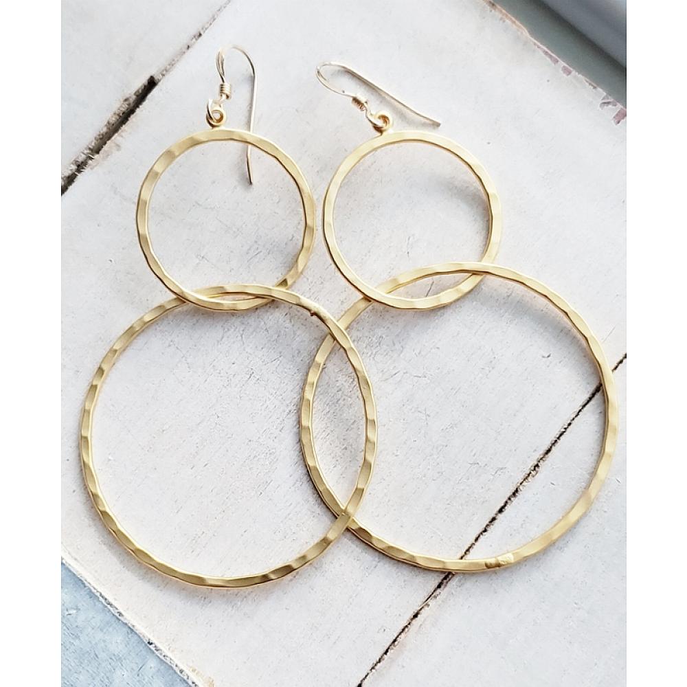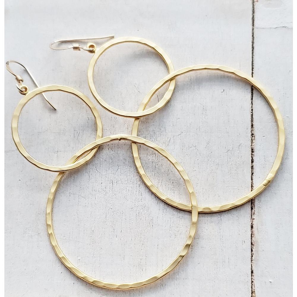 Modern matte gold hammered circle hoops earrings. These lightweight matte gold interlocking circle design are both sophisticated and fun!