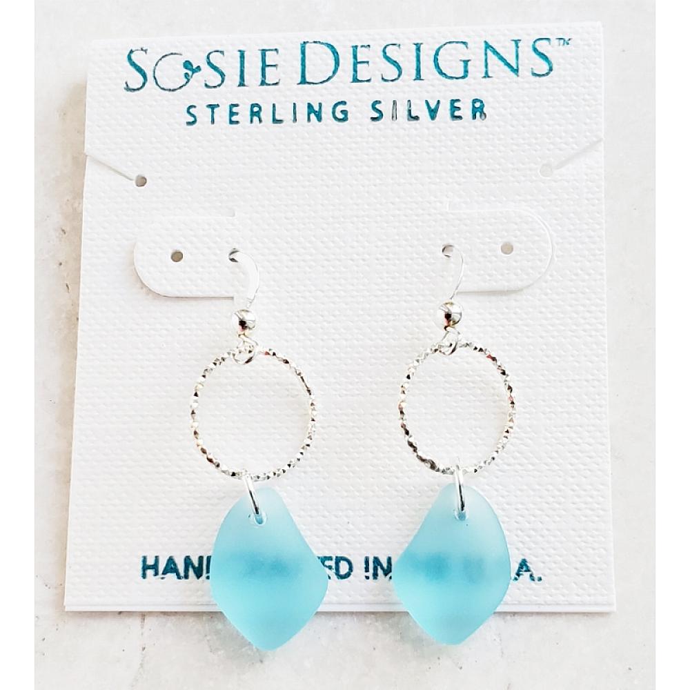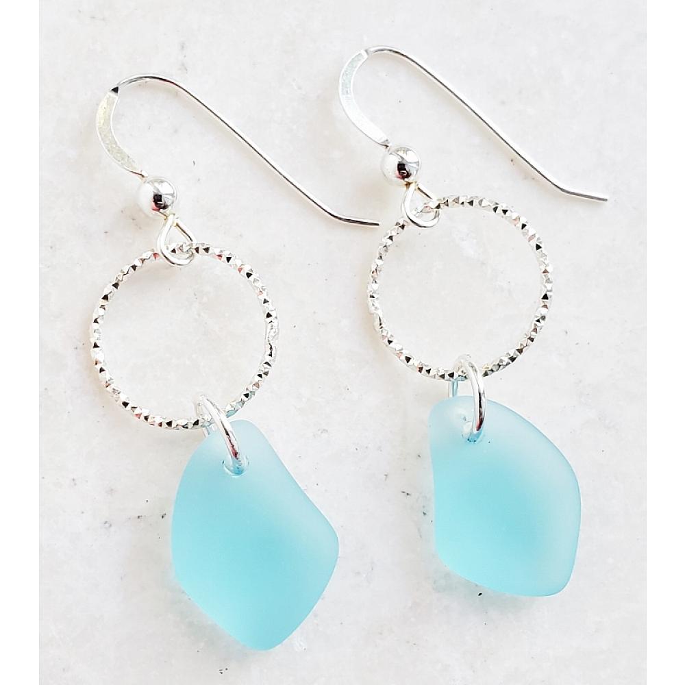 Effortless beach casual earrings! These dazzling yet elegant diamond cut sterling silver rings adorned with tumbled sea glass are perfect addition to your collections. These chic earrings are both lightweight and easy to wear for any occasions.