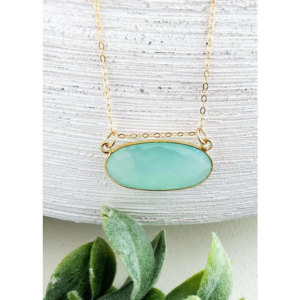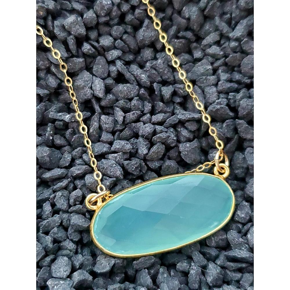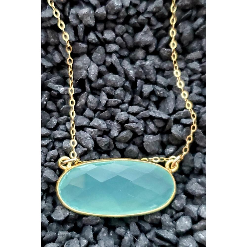 Add some gorgeous natural aqua chalcedony to your jewelry collection! These beautifully faceted oval in cased in gold over .925 sterling silver floats on 18" of 14k gold-filled cable chain w/ spring clasp.