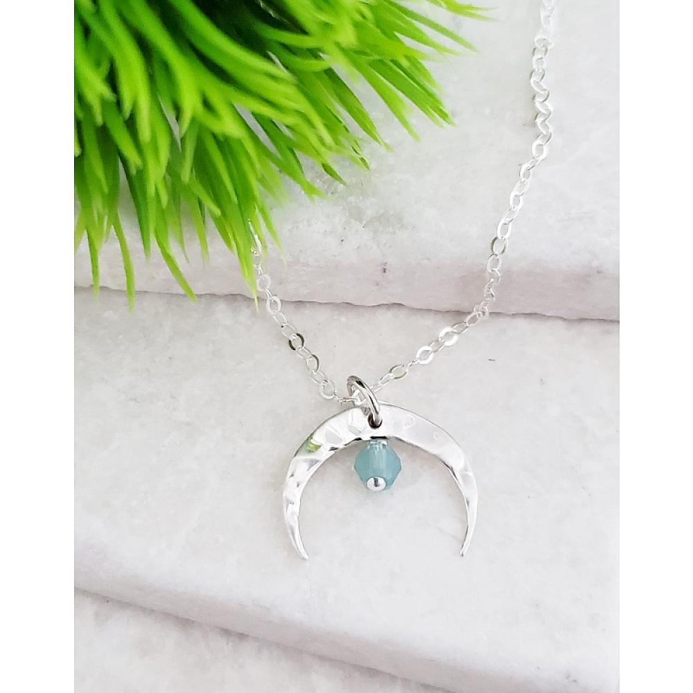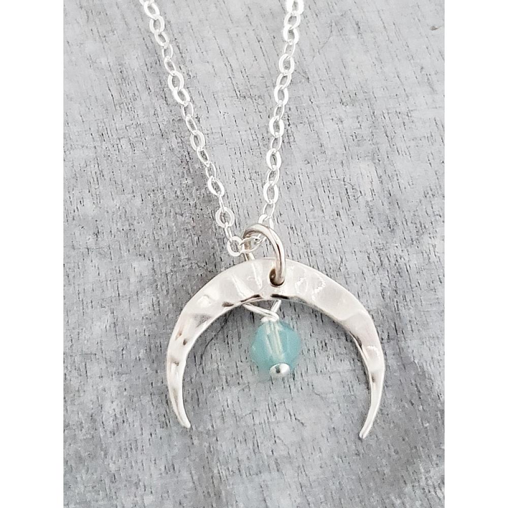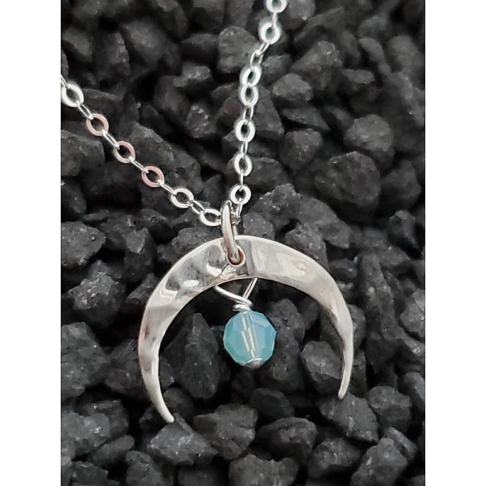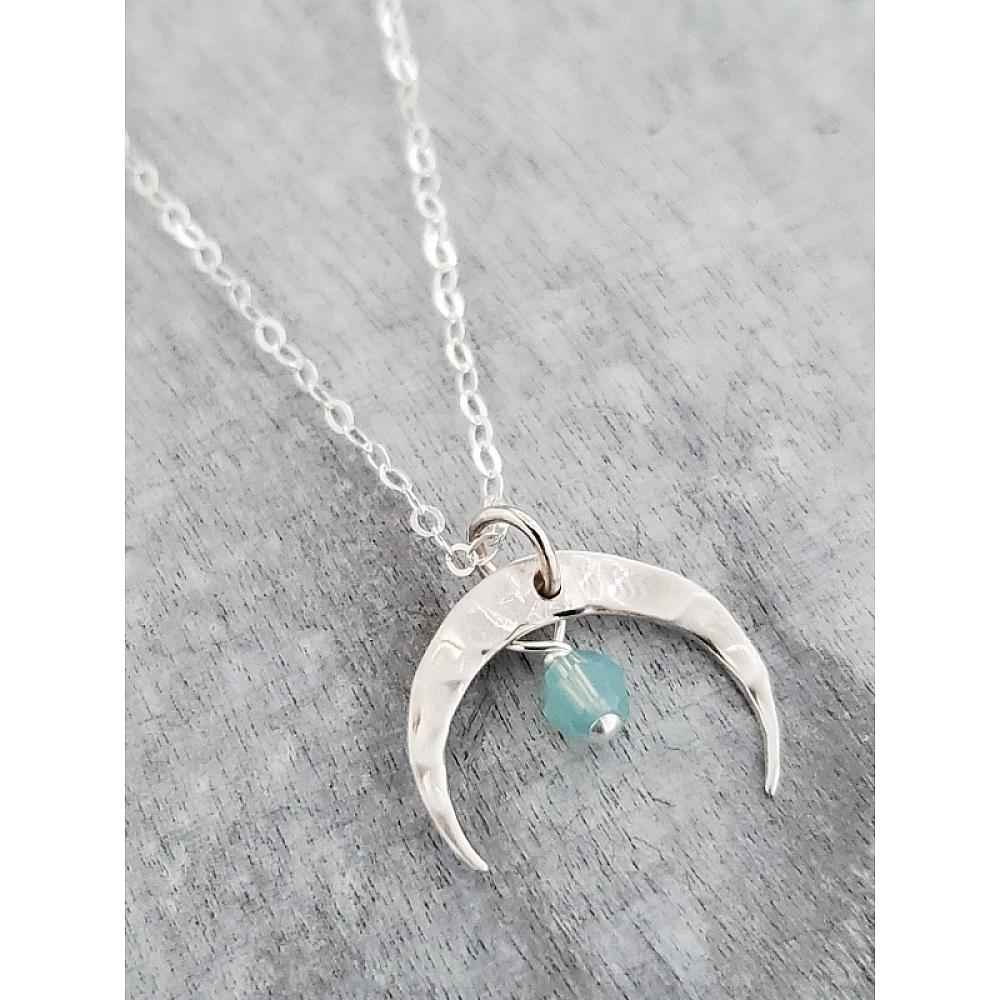 Inspirational sterling silver crescent moon with hammered finish and adorned with pacific opal crystal for an added touch! Comes with 18" .925 sterling silver cable chain with spring clasp.