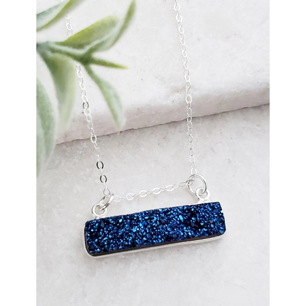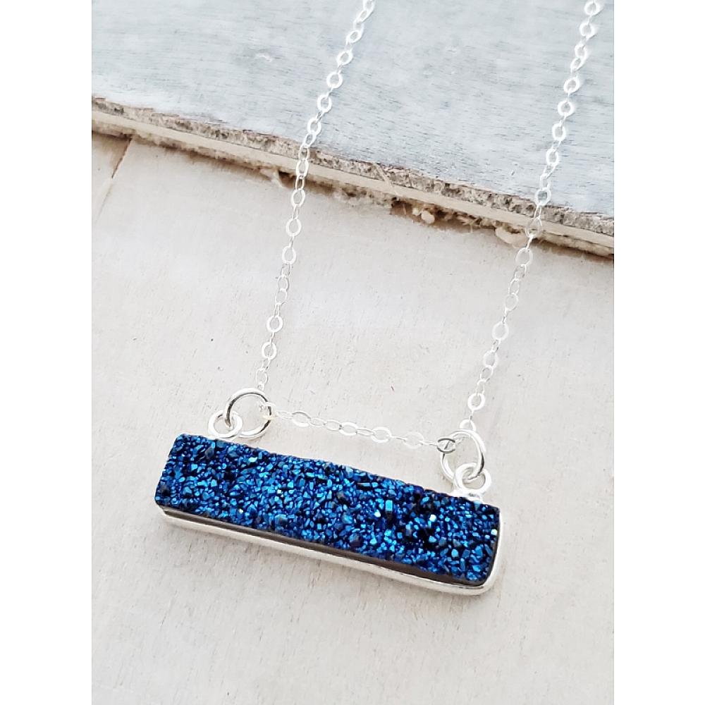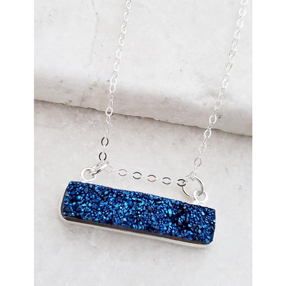 Right on trend! These dazzling druzy bar necklace are secured in bezel setting in .925 sterling silver and hangs in a dainty 18 inches of .925 sterling silver necklace with spring clasp. The bar druzy suspends and can move sideways. The druzy is in shimmering blue color, perfect for layering or wear it by itself.