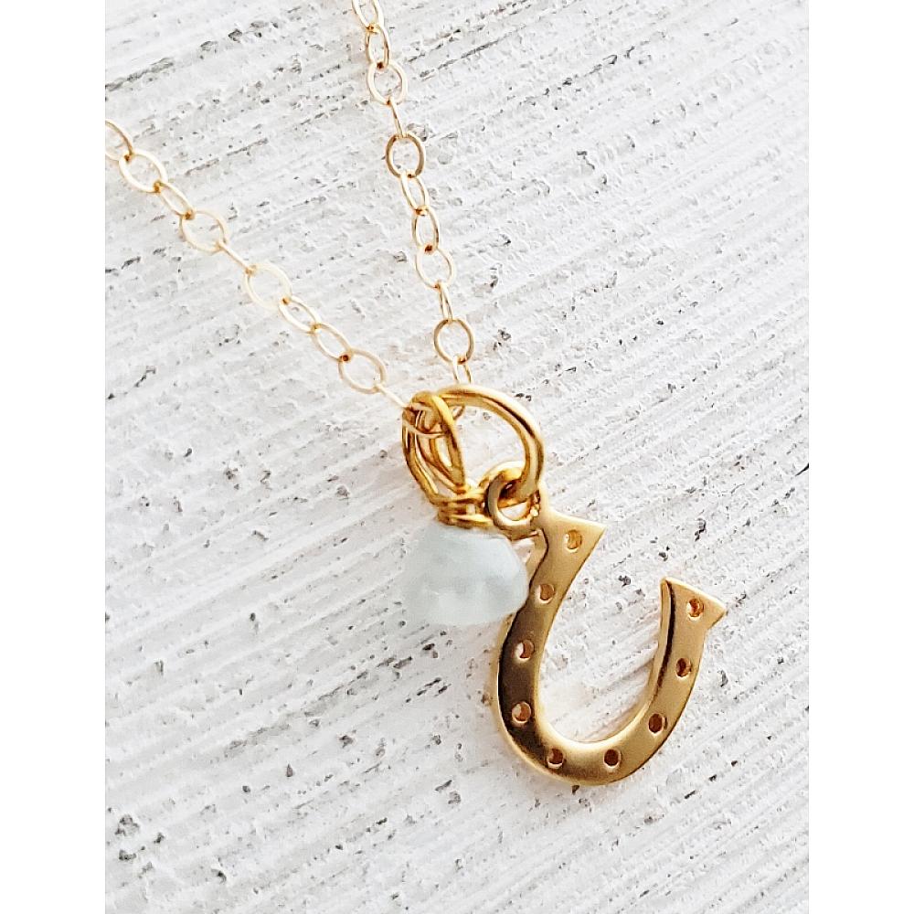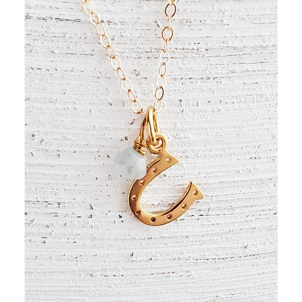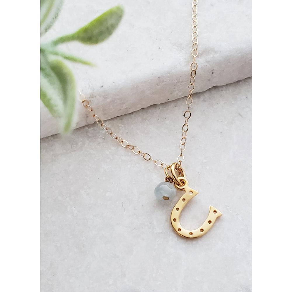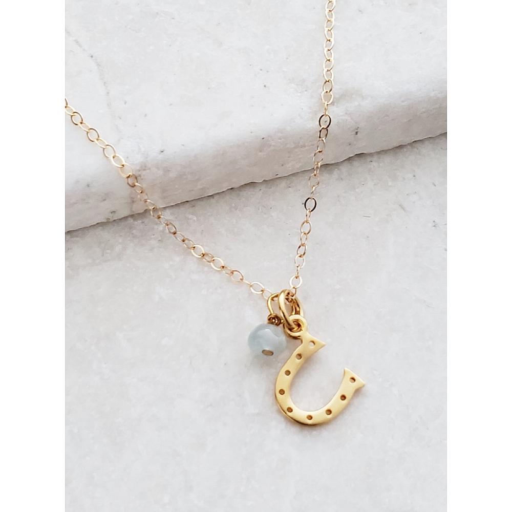 Catch your luck with this gold over sterling silver horseshoe with aquamarine stone. Comes with 14K gold-filled classic chain in 18" long with spring clasp for easy wear.