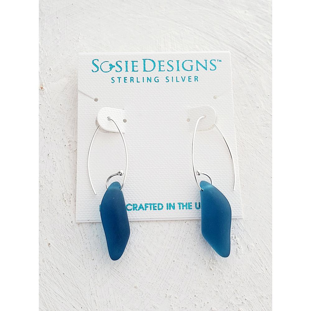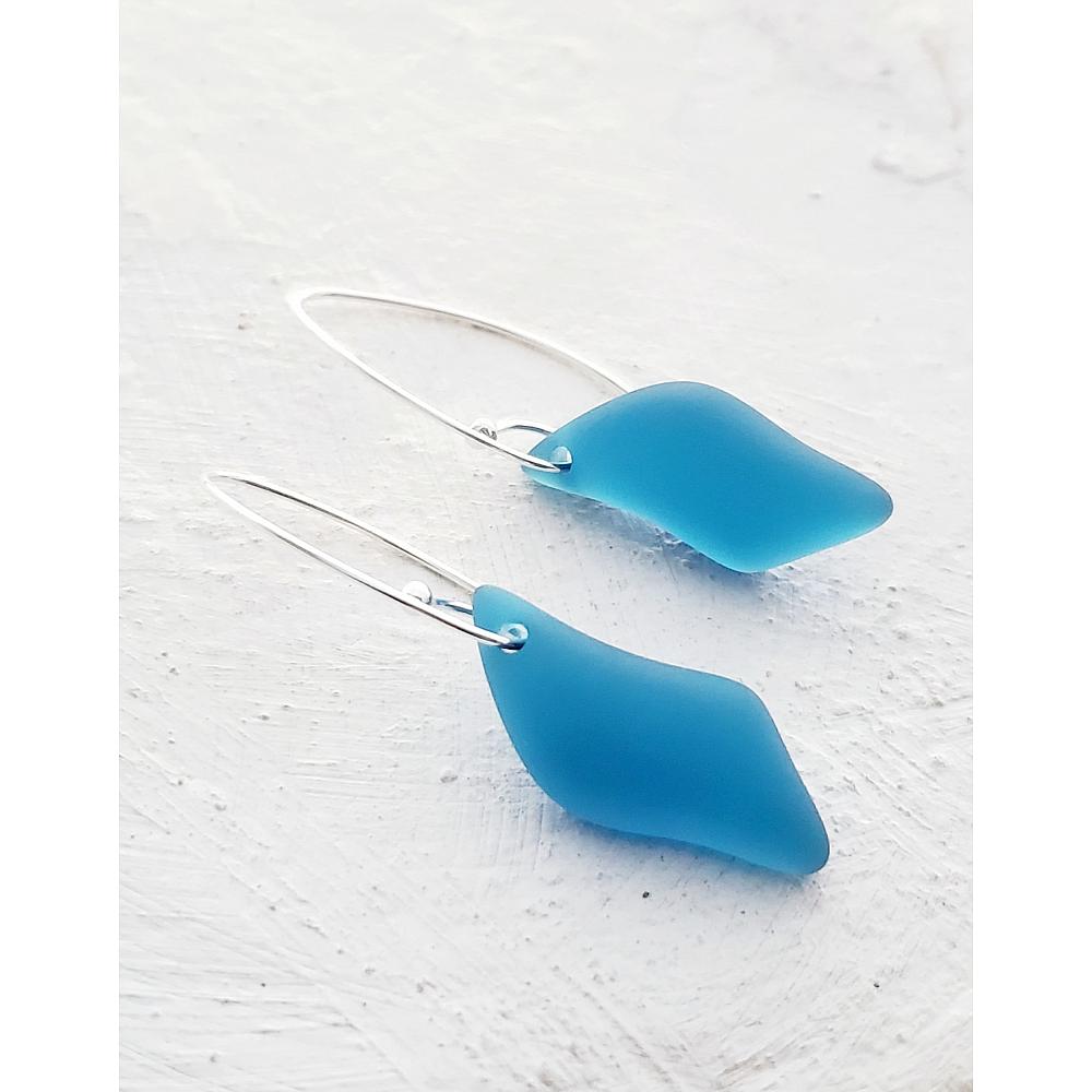 The eco cultured sea glass earrings are made with high-quality frosted glass that resembles ocean tumbled beach glass and comes in uniform shape and size.