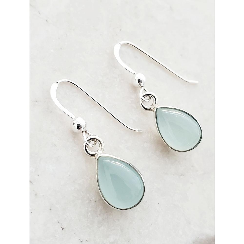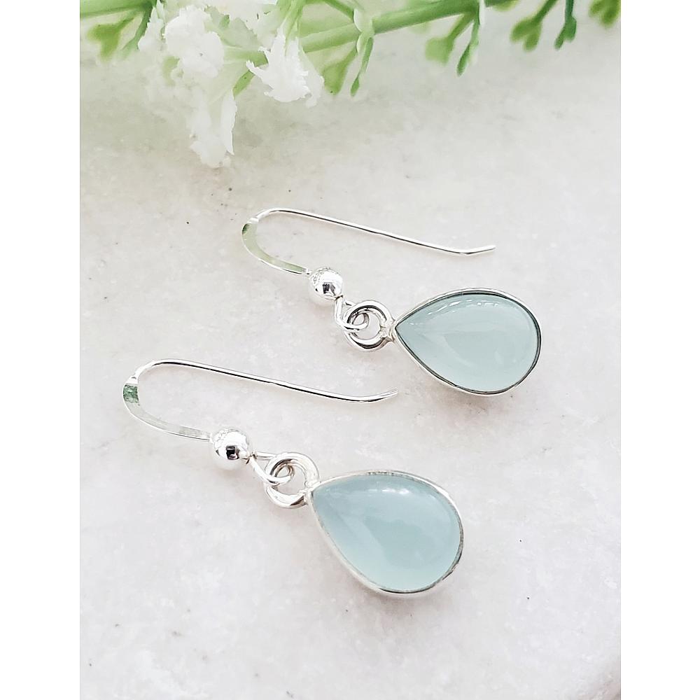 Effortless Style. These bezelled sterling .925 silver teardrop aqua chalcedony gemstone are designed for all-day wear. This staple earrings are chic, lightweight and endlessly versatile.