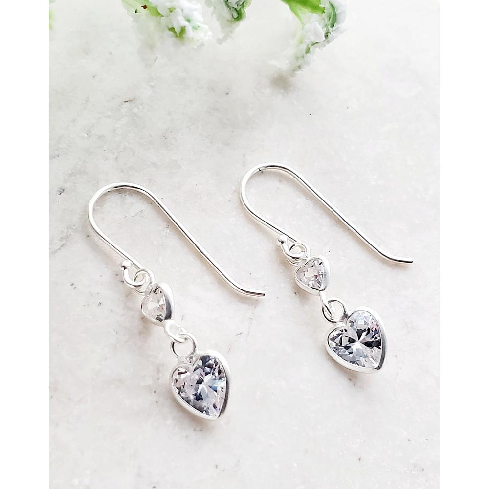 Minimalist Chic. These heartfelt double CZ heart design earrings adds a touch of spark to any outfit. The understated hook combined with CZ bezel in sterling .925 silver hearts are designed for all-day wear. This staple earrings are chic, lightweight and endlessly versatile.