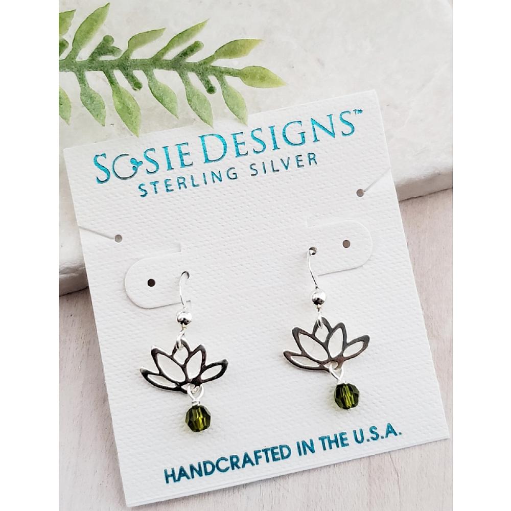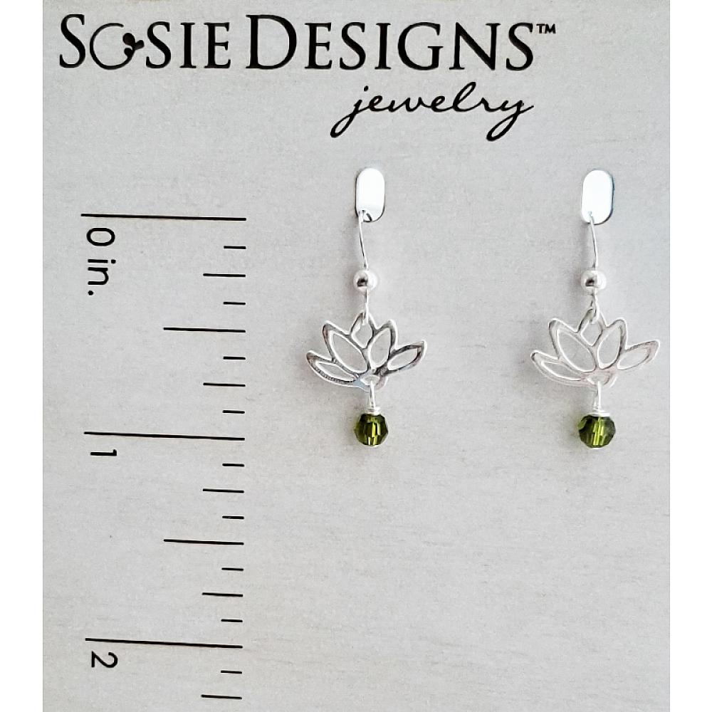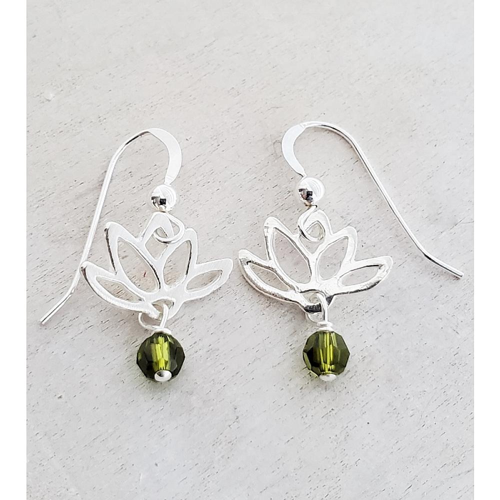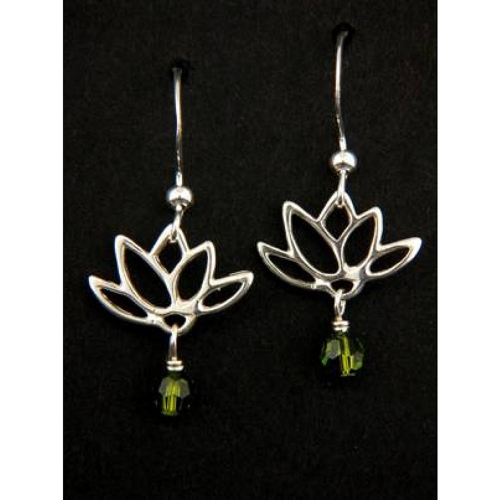 Beautiful Blooms. These delicate pair of lotus blossom earring makes a striking statement of simplicity that symbolizes purity, divine birth, and new beginnings.  For an added feminine flair, a dainty European crystal in olivine color adorns the lotus flower.