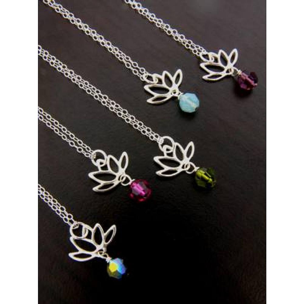 Beautiful Blooms. These delicate lotus blossom necklaces makes a striking statement of simplicity that symbolizes purity, divine birth, and new beginnings.  For an added feminine flair, a dainty European crystal in various color adorns the lotus flower.