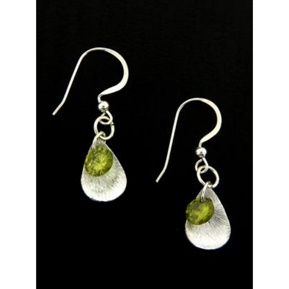 These earrings are finely crafted sterling silver brushed petals with a drop of brilliant round cubic zirconian in olivine green. Modern yet so delicate!