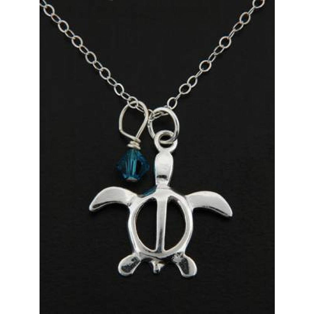 Ocean Lovers Delight! This beautiful sterling silver sea turtle necklace was inspired by the Hawaiian Honu - sea turtle and paired with indicolite European crystal for an added appeal. Comes with sterling silver 18" chain with spring clasp.