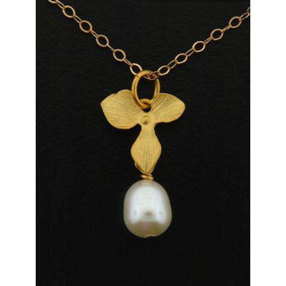 The timeless pairing of gold-tone and white pearl plays out swimmingly in this ultra feminine piece that exudes elegance. The brilliant white pearl drop contrasts against the detailed orchid for a delicate and luxurious design.
