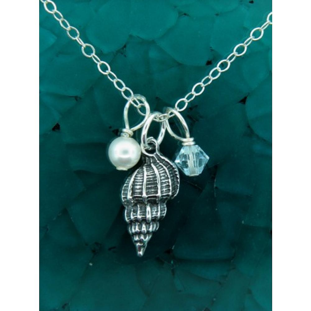 Feel the Sandy Beach! Detailed .925 sterling silver dainty sea shell necklace charm adorned with light azure European crystal and white crystal pearl for a beachy feel. Comes with 18" sterling silver chain with spring clasp for easy wear.
