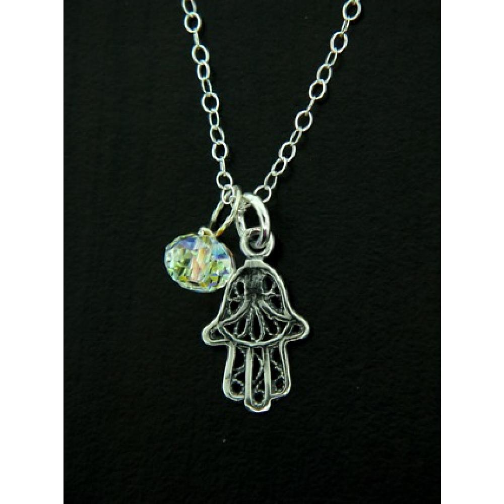 Guard yourself against the evil eye with this .925 sterling silver dainty filigree hamsa hand with European crystal in clear ab color. Comes with 18" sterling silver classic chain with spring clasp for easy wear.
