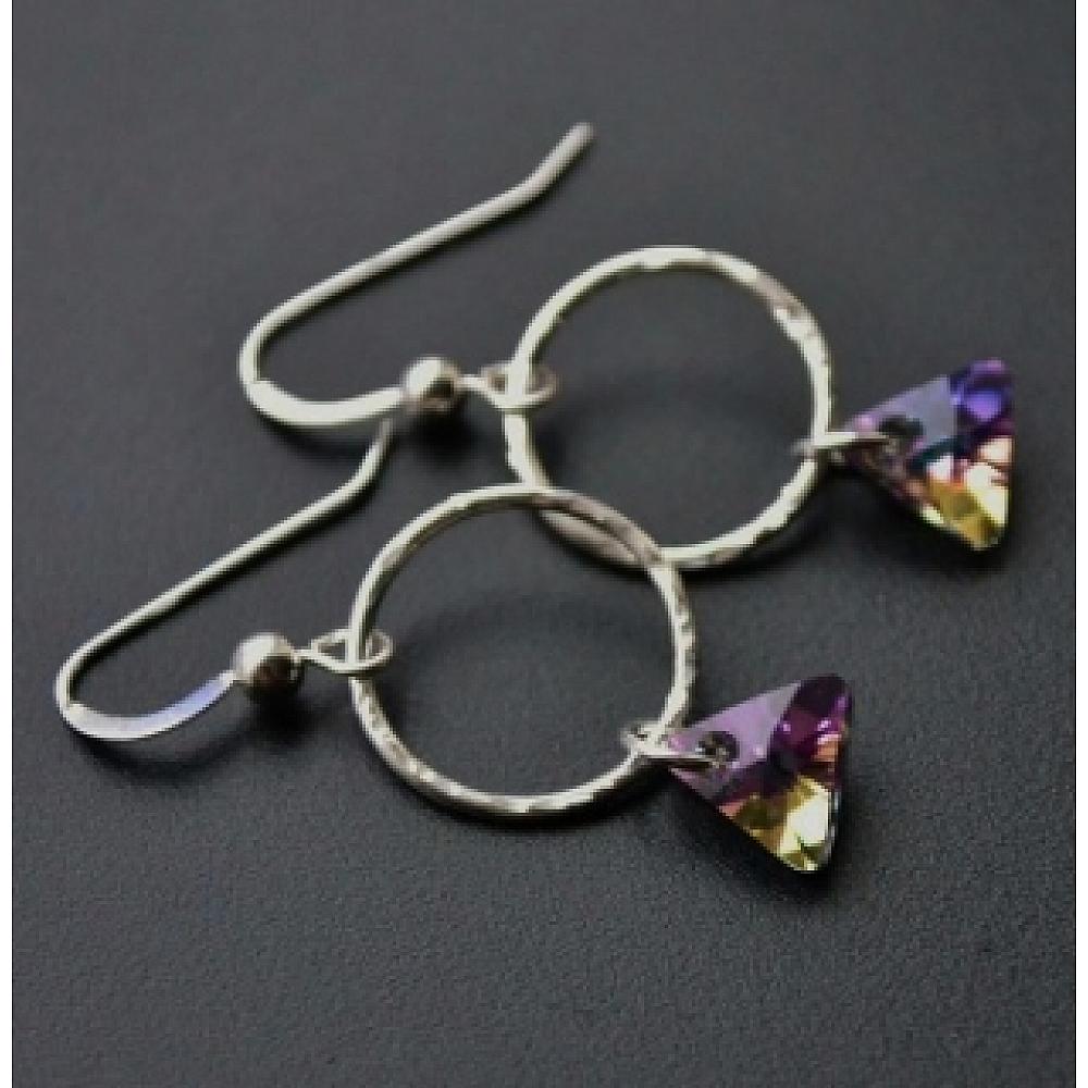 • .925 Sterling silver hand-hammered hoop and aurora borealis coated iridescent vitrail purple colored faceted triangle shaped European crystal drop charms