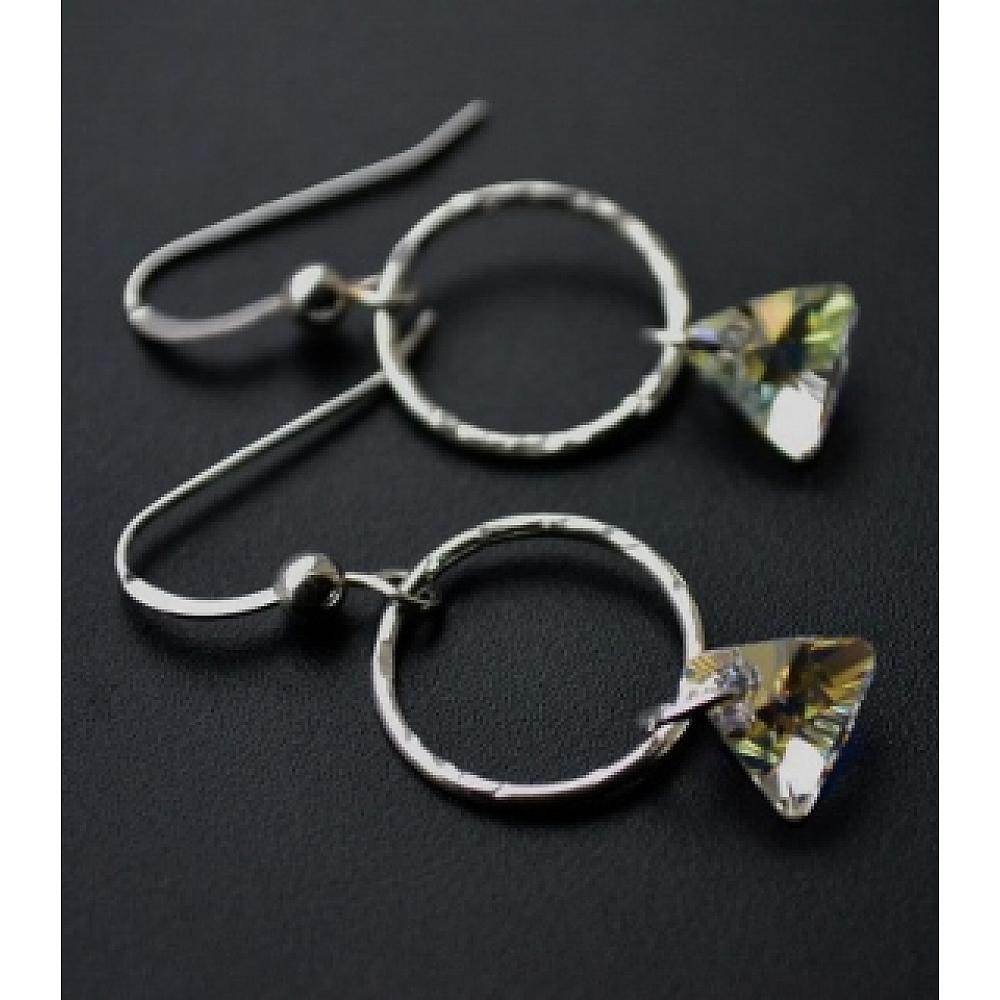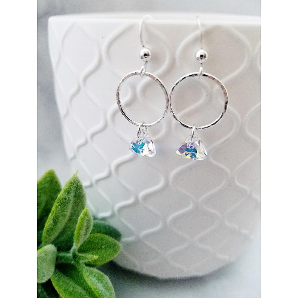 • .925 Sterling silver hand-hammered hoop and aurora borealis iridescent clear colored faceted triangle shaped European crystal drop charms