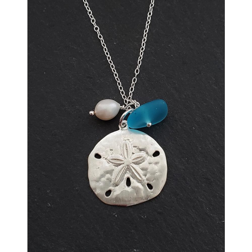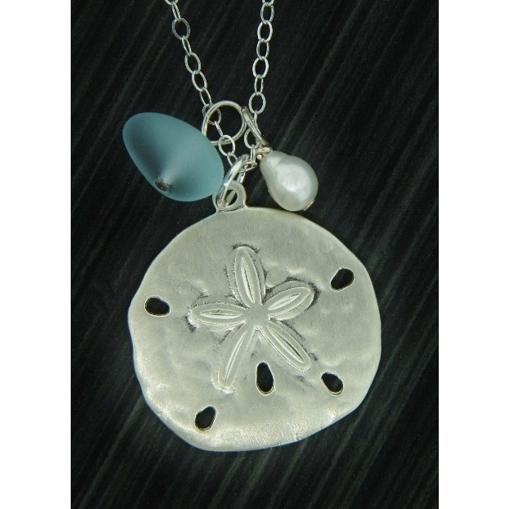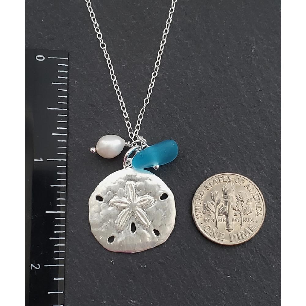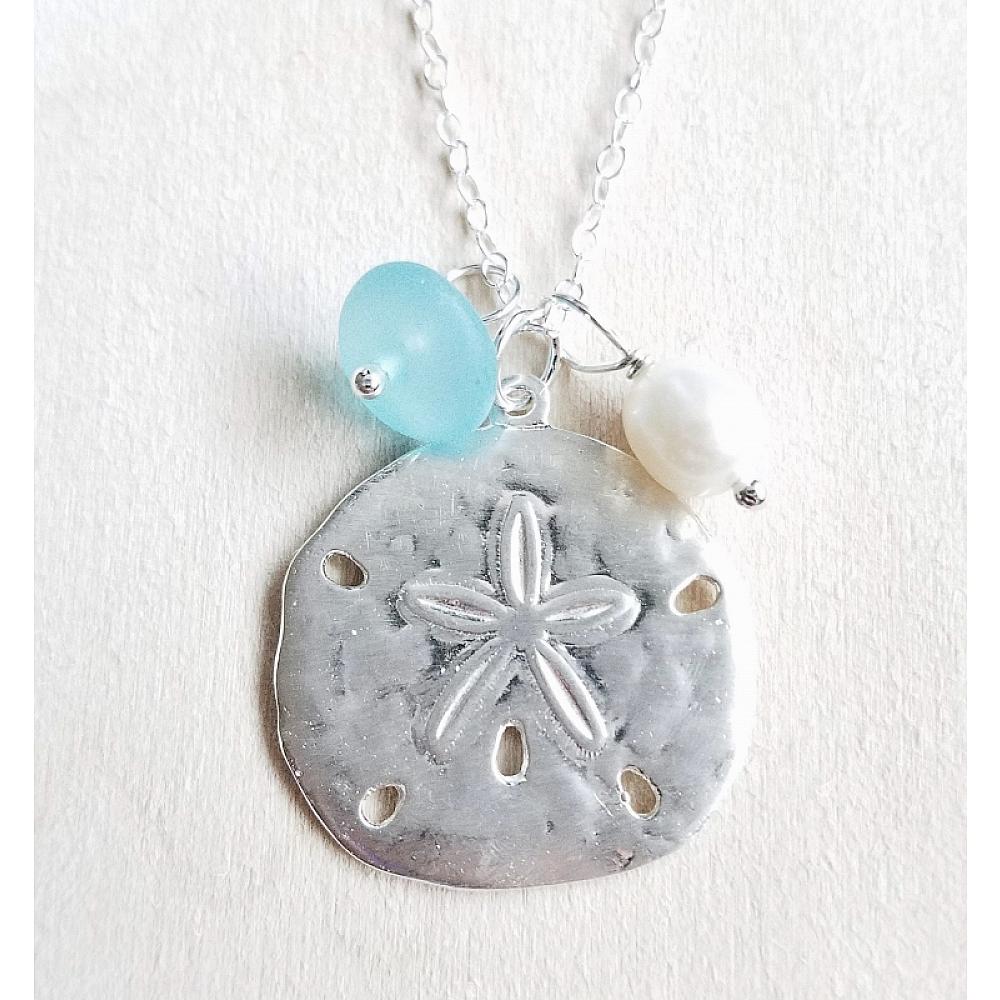 Perfect seaside treasures! This fun and beachy large silver sand dollar necklace adorned with white freshwater pearl and free form cultured sea glass comes with 18” sterling silver cable necklace with spring clasp.