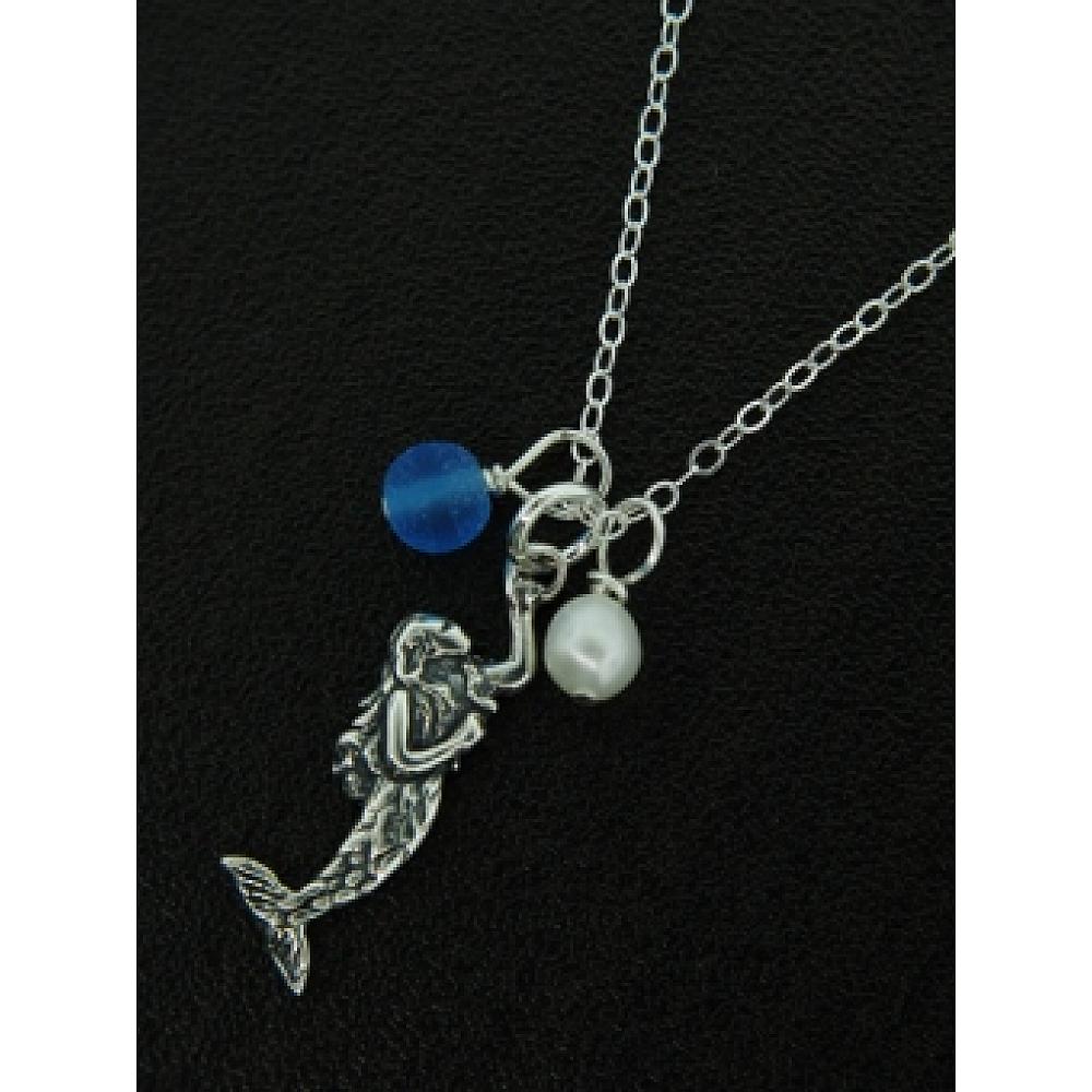 Mystical and magical mermaid sterling silver necklace adorned with cultured sea glass and freshwater pearl hangs on 18" sterling silver cable chain with spring clasp.
