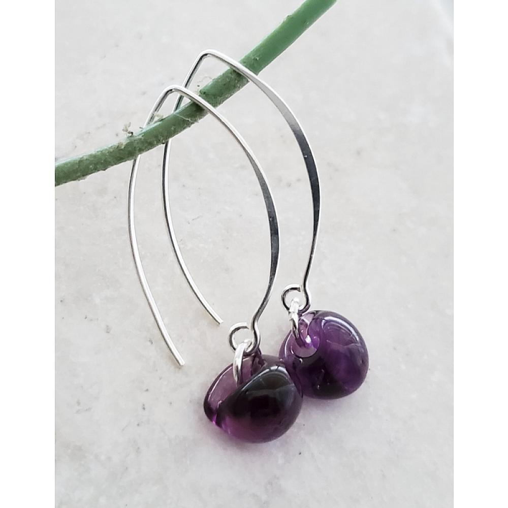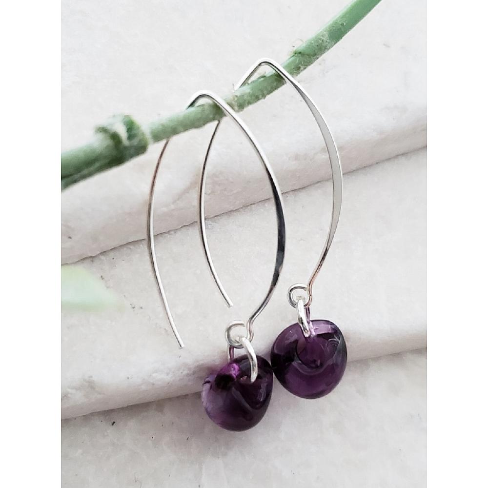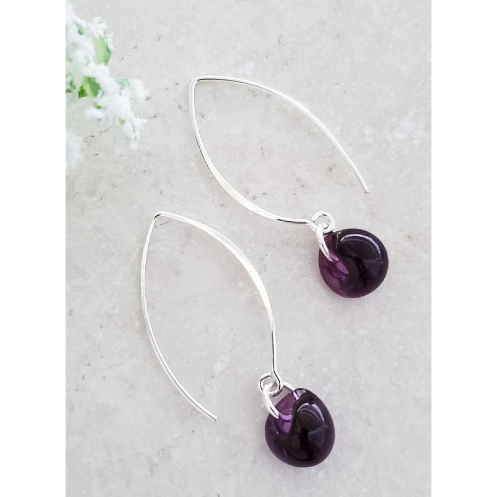 Infuse any elegant ensemble with the classic look of these curled marquis earrings met with beautiful handmade lampwork drops. A classic combination of deep mystic purple and silver.