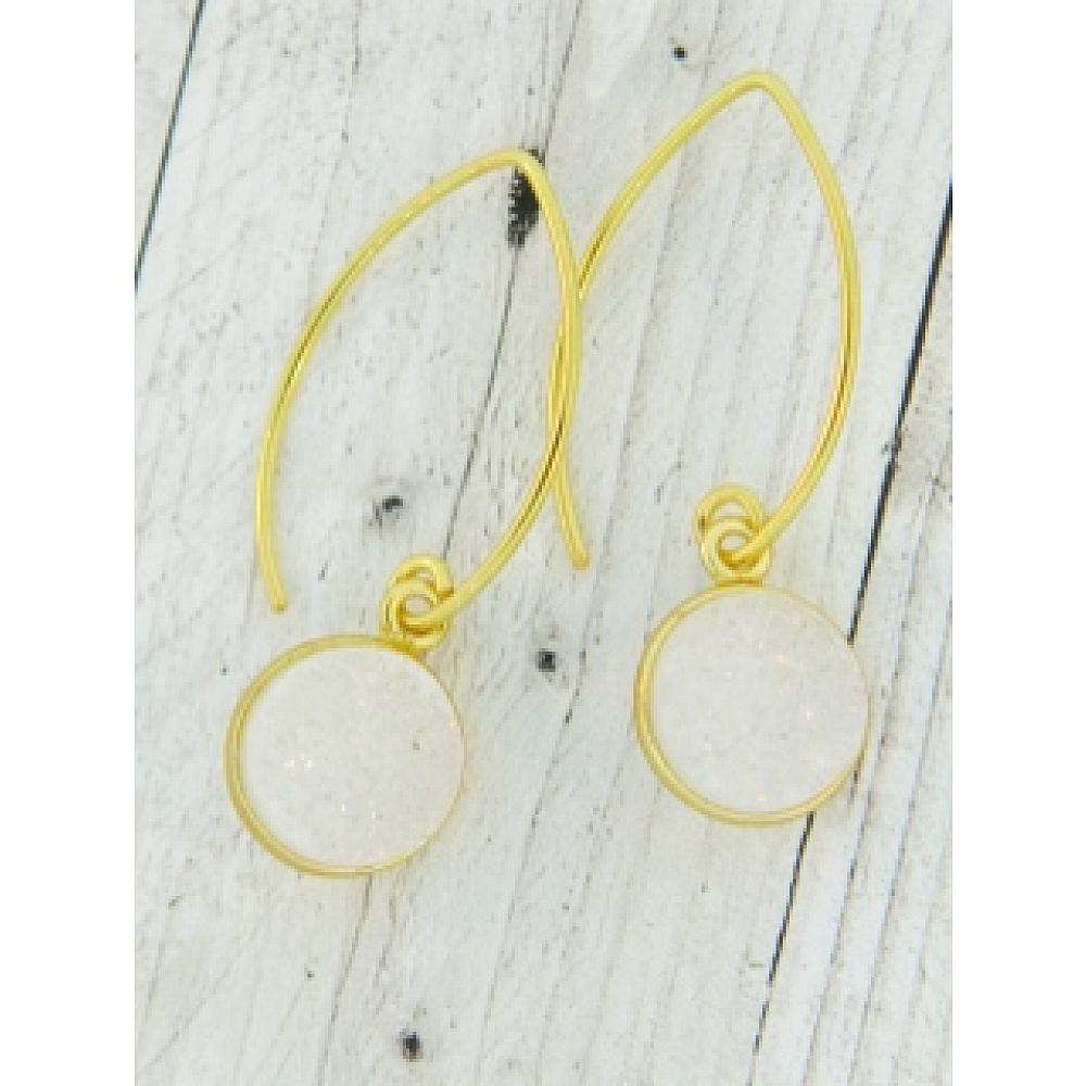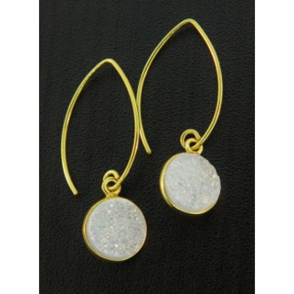 Right on trend! These dazzling druzy earrings in bezel setting in gold over sterling silver hangs in marquis earwires for easy wear. The druzy is in shimmering rainbow white, perfect for everyday wear.