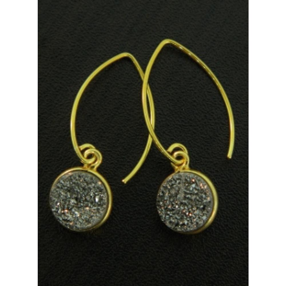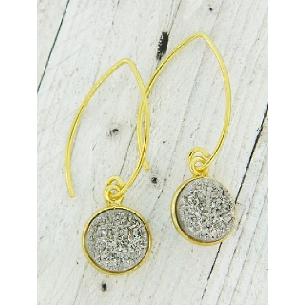 Right on trend! These dazzling druzy earrings in bezel setting in gold over sterling silver hangs in marquis earwires for easy wear. The druzy is in shimmering grey, perfect for everyday wear.