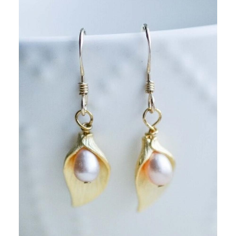 Dainty and feminine gold plated lily with tiny freshwater pearl in pink/peach. Comes with 14k gold-filled French earwires for easy wear.