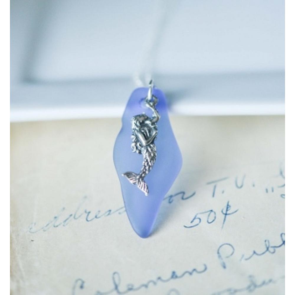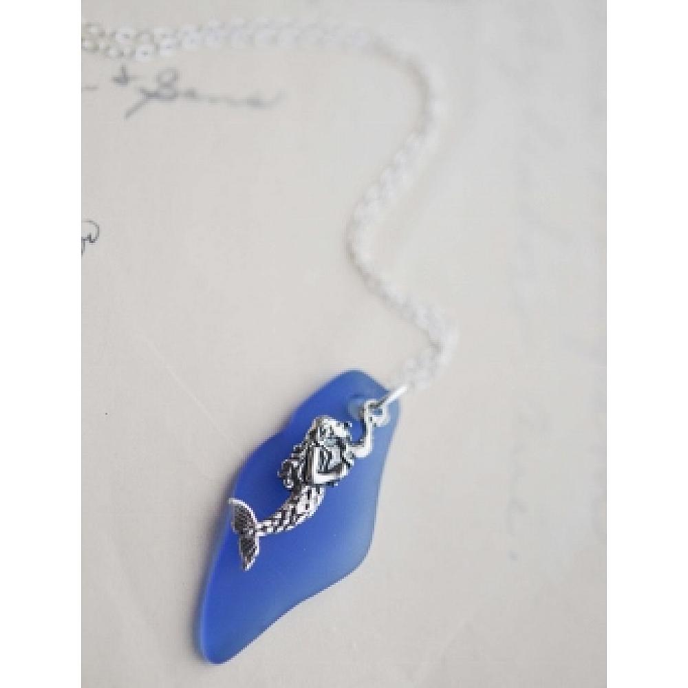 Mystical mermaid in sterling silver adorned with shard cultured sea glass in cobalt blue.