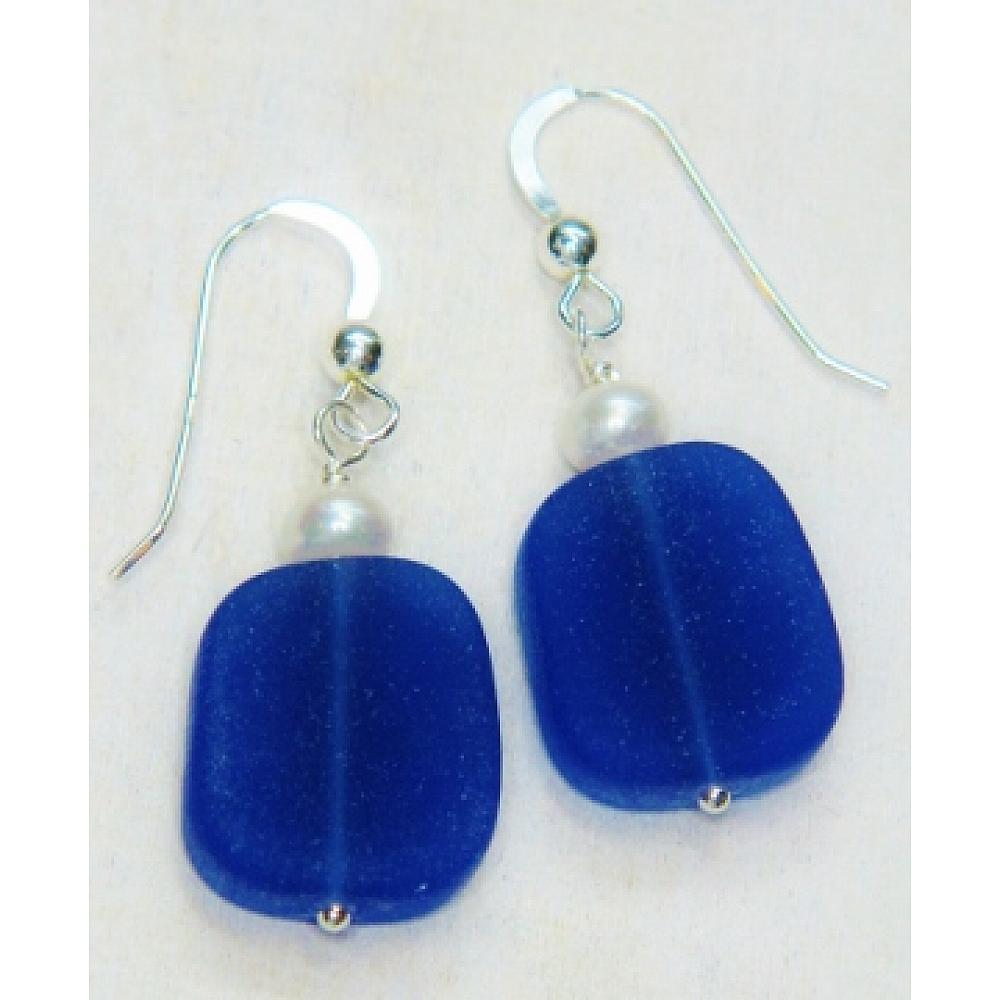 These unique cobalt blue free form cultured sea glass earirngs resembles ocean tumbled sea glass with freshwater pearl in sterling silver.