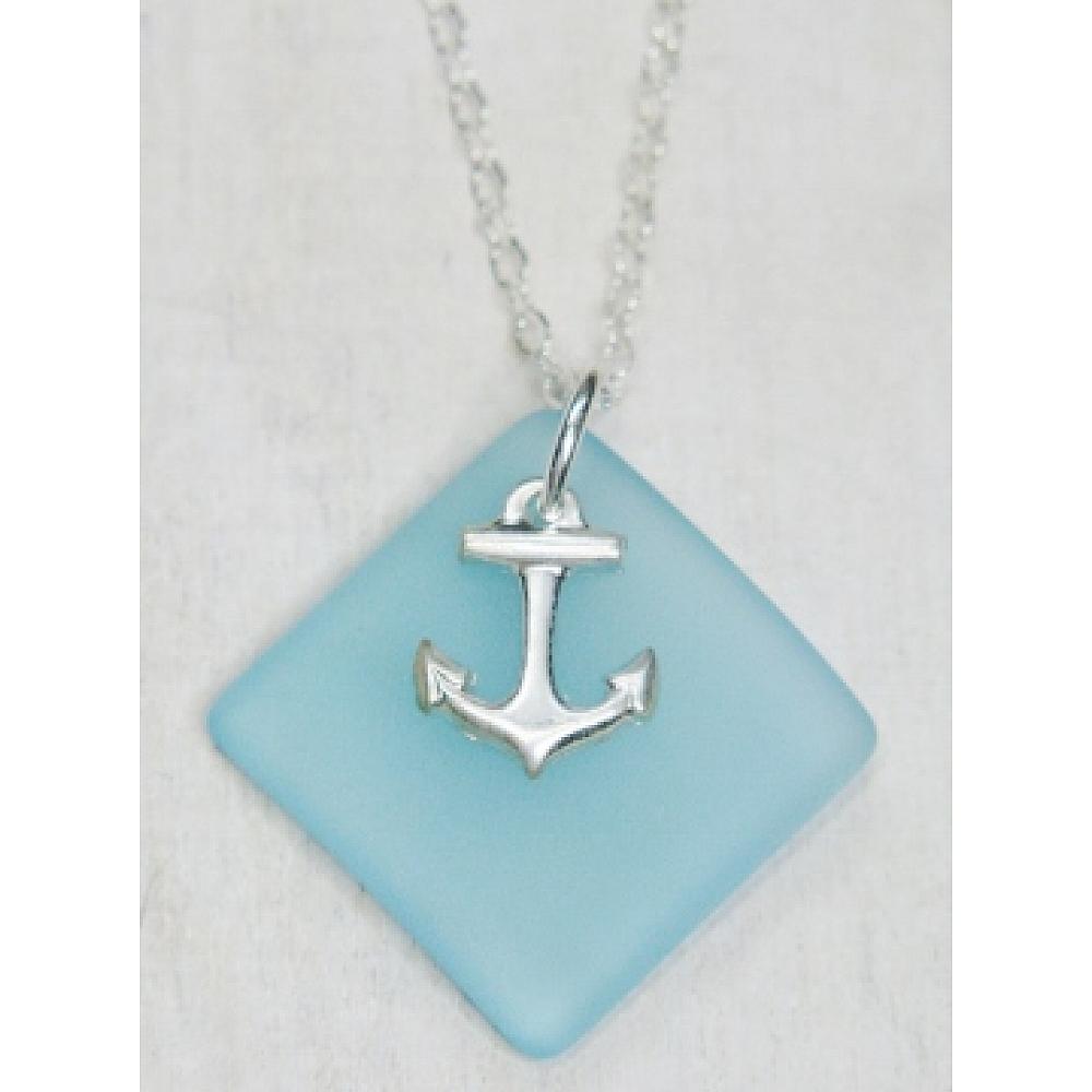 #2807-1 Eco Sea Glass Diamond Anchor Necklace - Turquoise