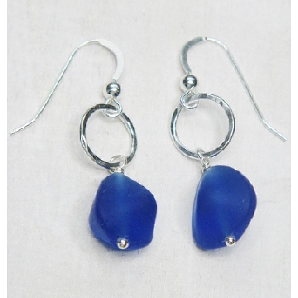 #1817 Eco Sea Glass with Hammered Ring Earrings - Cobalt Blue