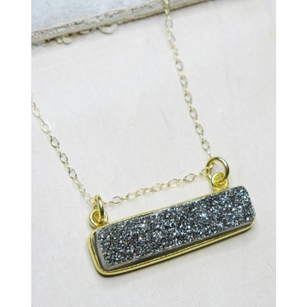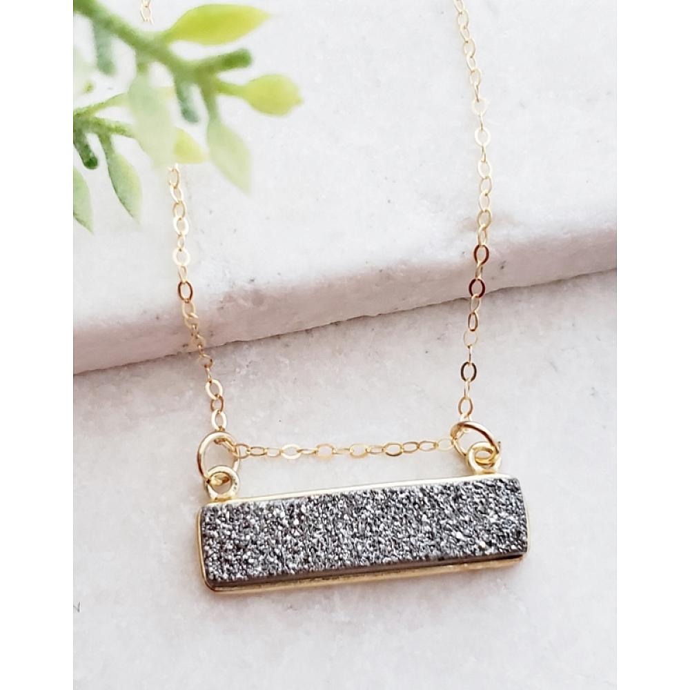 Right on trend! These dazzling druzy bar necklace are secured in bezel setting in gold over sterling silver and hangs in a dainty 18 inches of 14k gold-filled necklace with spring clasp. The bar druzy suspends and can move sideways. The druzy is in shimmering neutral grey color, perfect for layering or wear it by itself.