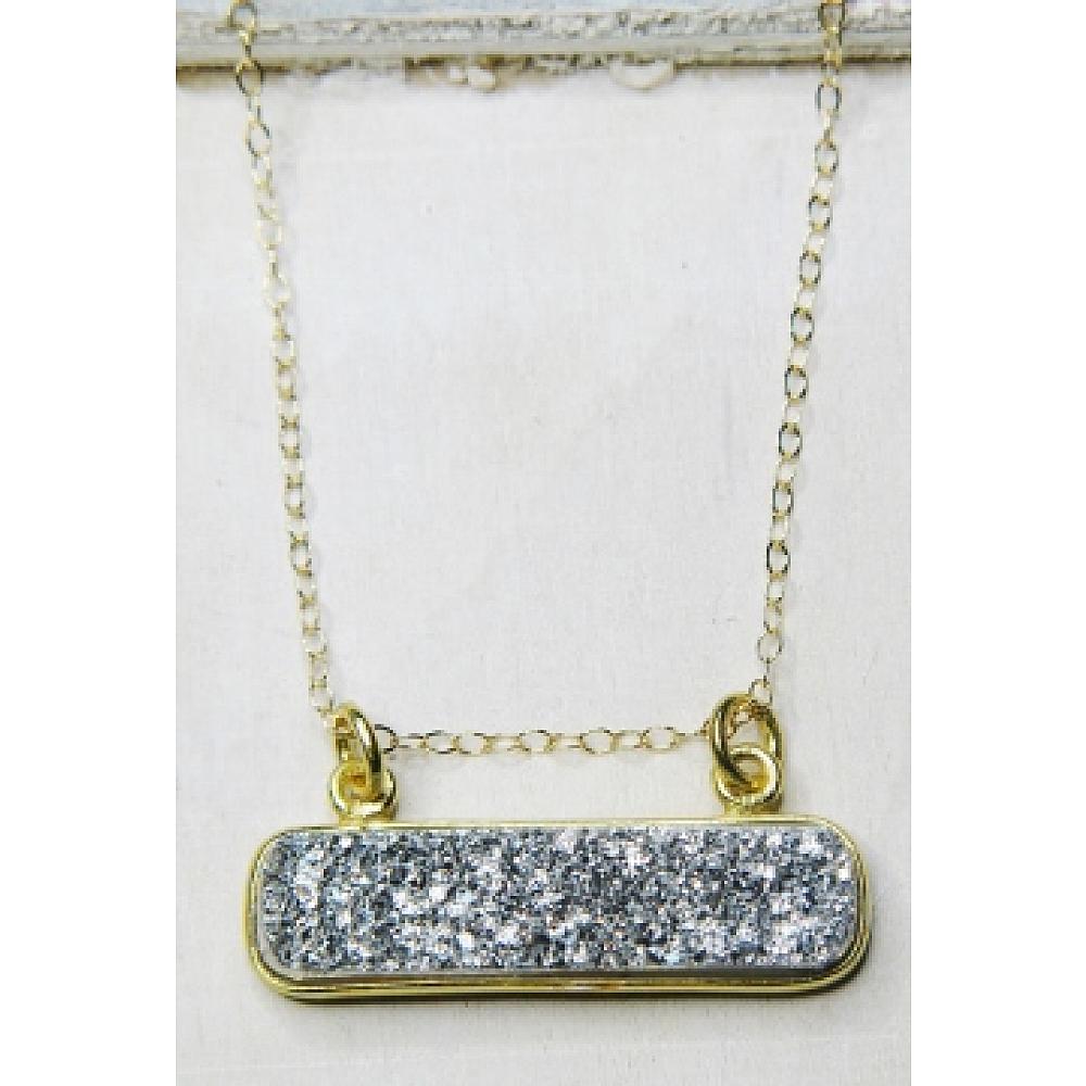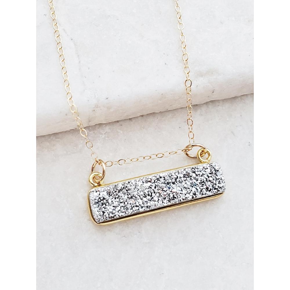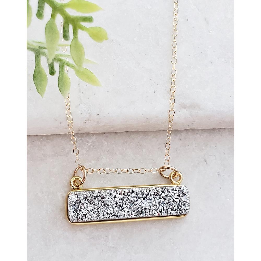 Right on trend! These dazzling druzy bar necklace are secured in bezel setting in gold over sterling silver and hangs in a dainty 18 inches of 14k gold-filled necklace with spring clasp. The bar druzy suspends and can move sideways. The druzy is in shimmering neutral silver color, perfect for layering or wear it by itself.