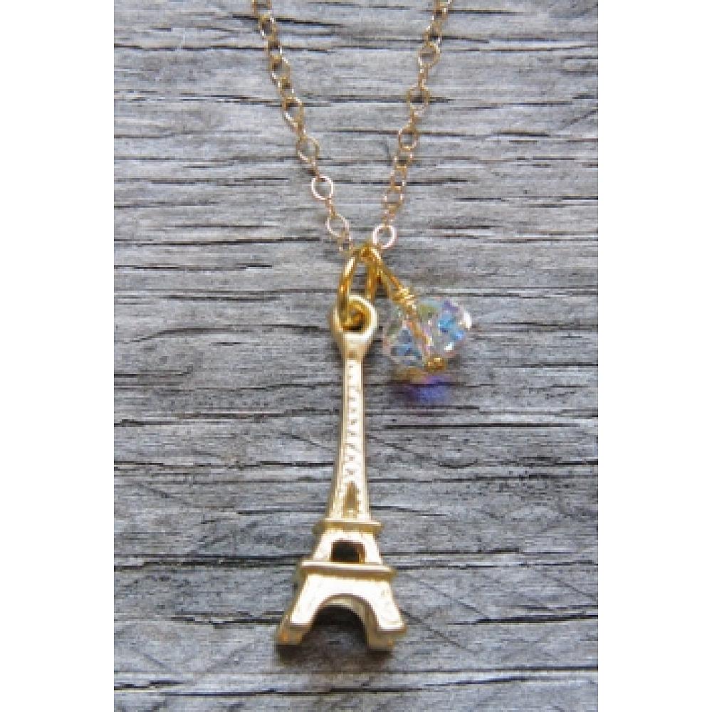 Express Yourself! This sweet detailed 3D gold plated Eiffel Tower with the finest European crystal in clear ab. Dangles from a 18" 14K gold-filled cable chain with spring clasp.