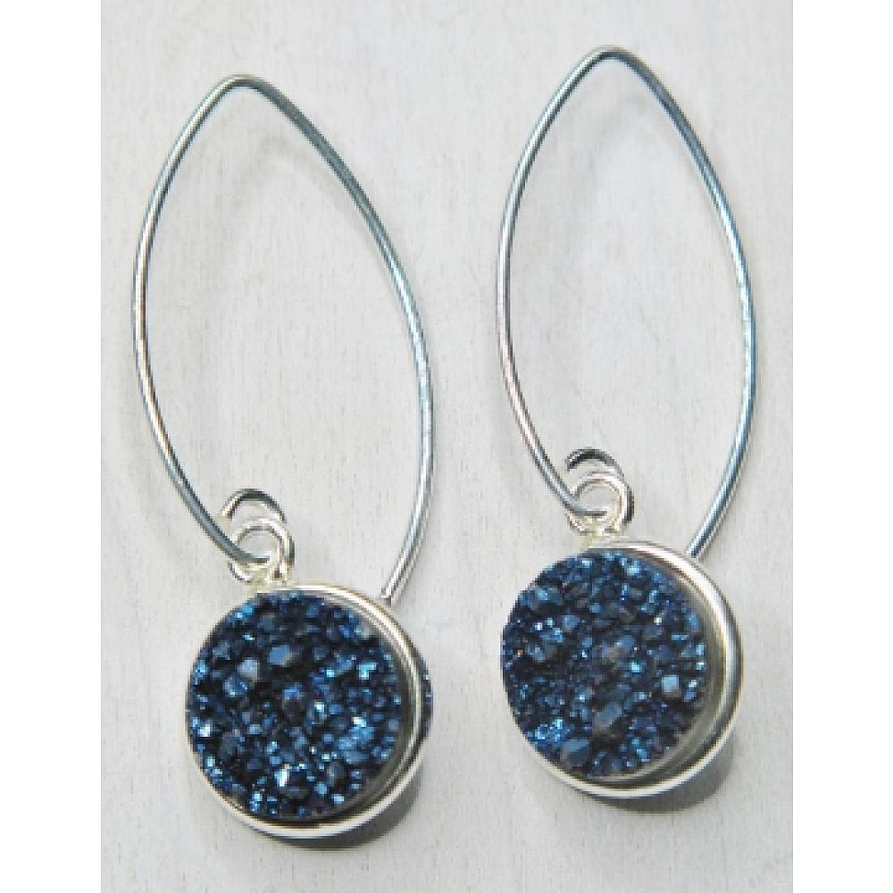 Right on trend! These dazzling druzy earrings in bezel setting in sterling silver hangs in marquis earwires for easy wear. The druzy is in shimmering blue, perfect for everyday wear.