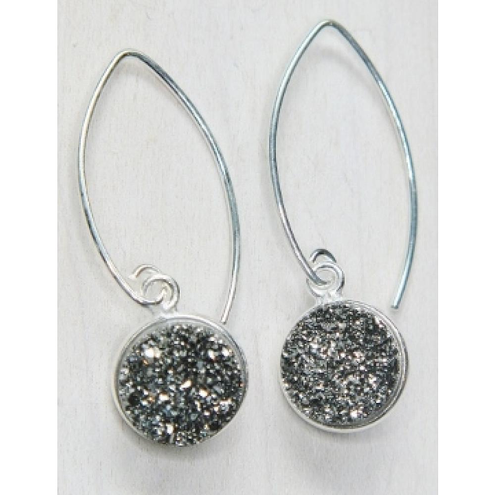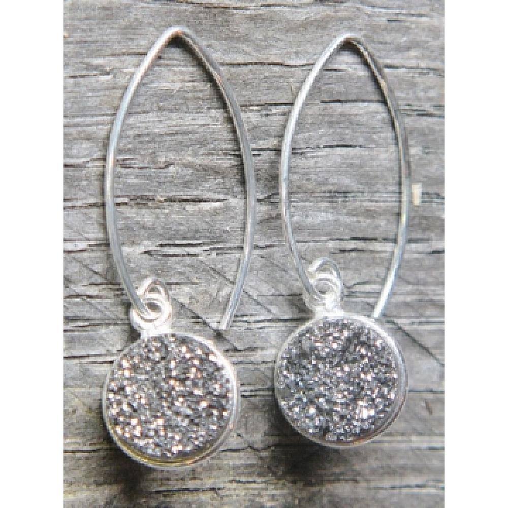Right on trend! These dazzling druzy earrings in bezel setting in sterling silver hangs in marquis earwires for easy wear. The druzy is in shimmering grey, perfect for everyday wear.