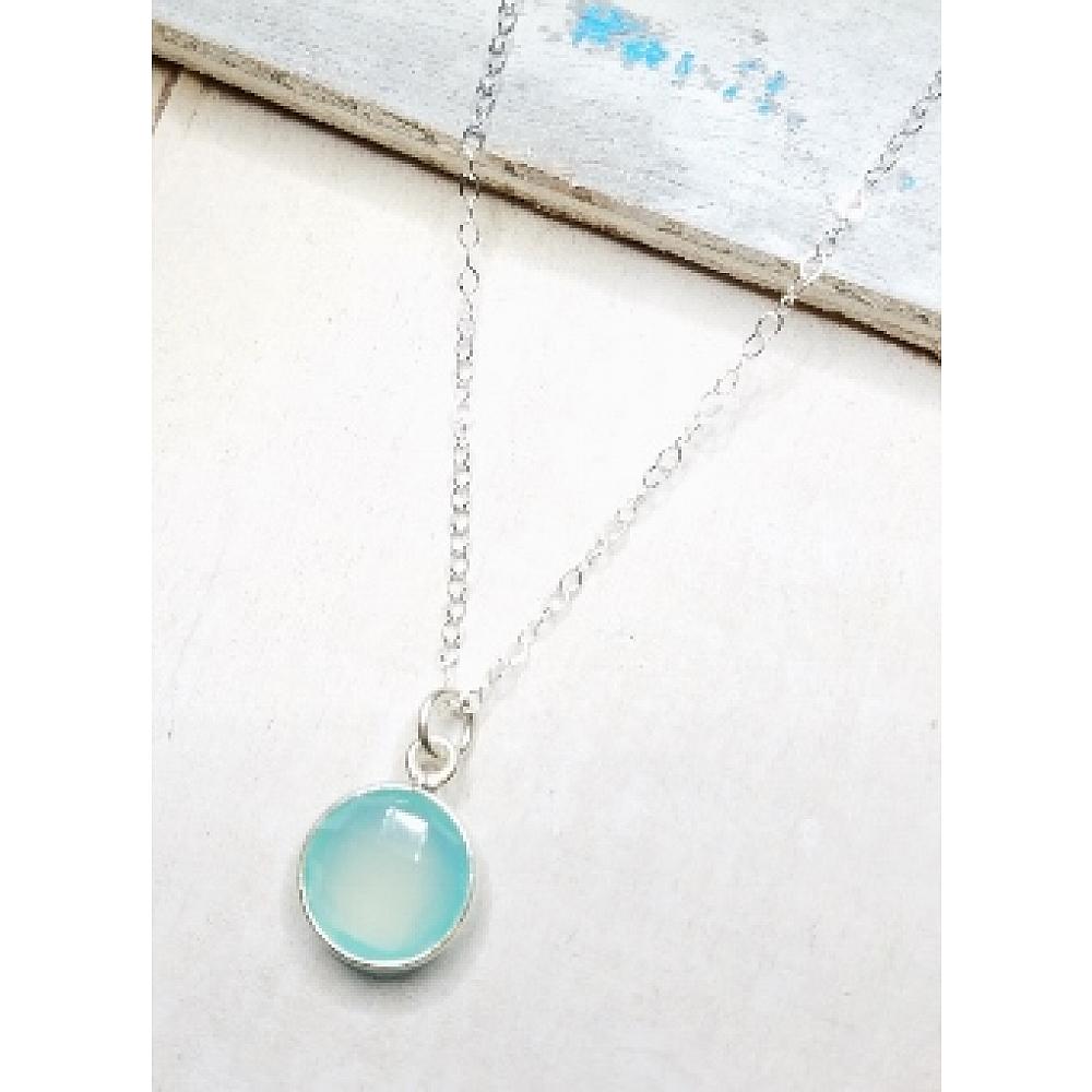 Stunning aqua chalcedony gemstone bezel set in round sterling silver pendant hangs on a delicate .925 sterling silver 18” cable chain with spring clasp.