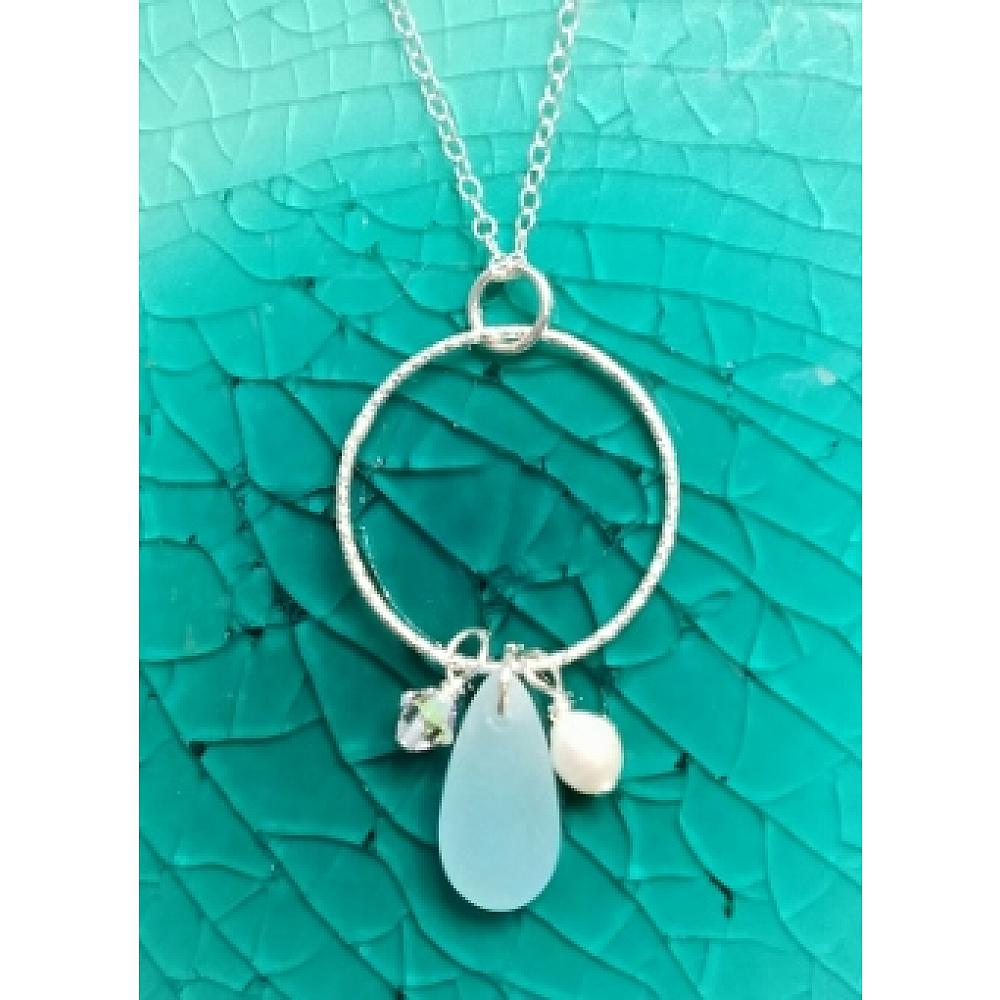 Get Your Beachcomber Style On! Explore the beach with these beach worthy accessory in sterling silver with cultured eco sea glass teardrop, white freshwater pearl and European crystal in indicolite hue. 18" Sterling silver cable chain with spring clasp.